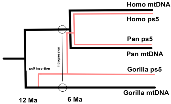 The ps5 pseudogene shares affinities with the gorilla lineage mtDNA [7] which suggests that it originated in the gorilla lineage. With the probability of a NUMT insertion being unaffected by hybridization, it is clear that the insertion happened prior to the introgression event, and that the pseudogene had been evolving in the gorilla lineage for a period of time before introgressing into Pan and Homo [7].