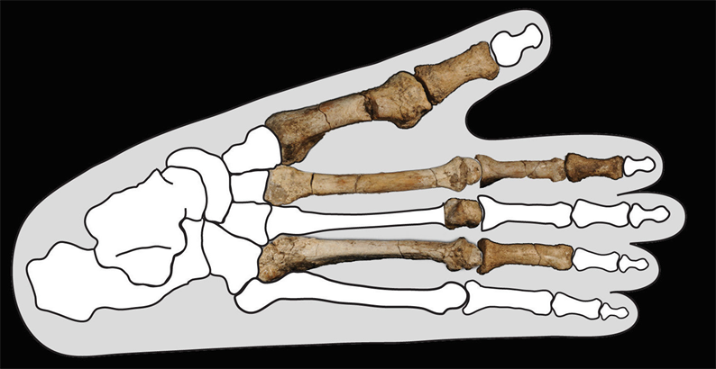 Figure 4. The Burtele foot, BRT-VP-2/73, found in 2009 [15] in Burtele at Woranso-Mille, Afar, tentatively assigned Au. deyiremeda [15], contemporaneous with Au. afarensis, shows distinct locomotor adaptation as it retains a grasping hallux, in contrast to the human-like adducted hallux that had developed in Australopithecus afarensis. The conclusive evidence that hominin evolution was caused by introgression from Gorilla suggests that Au. deyiremeda is better classified as Paranthropus deyiremeda. With a revised taxonomic classification, building on a combination of genomic data and fossil records, it can be predicted that Paranthropus and Australopithecus, like Pan and Homo,diverged through lineage sorting as the two lineages co-opted genes from the Gorilla lineage to adapt for separate niches.