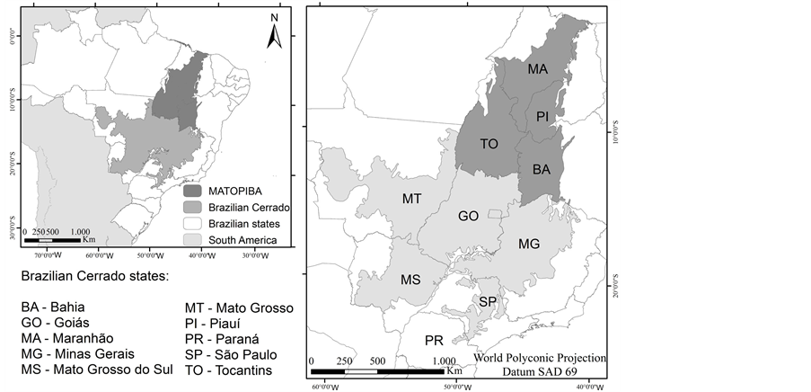 with scattered trees (campo sujo), savannah (cerrado in the strict sense), and woodland (cerradão) [28] [33] . The Cerrado region is considered as one of the most important and threatened ecosystems in the world [34] due to agricultural extensification and corresponds to a land degradation hotspot where large areas are being affected by erosion process [8] . In addition, the Cerrado region is home of the Brazil’s new agriculture frontier, commonly called “MATOPIBA” which is an acronym created from the first two letters of the four Brazilian states: Maranhão (MA), Tocantins (TO), Piauí (PI) and Bahia (BA). This region has been characterized by rapid changes in land cover and land use for pasture and cropland [35] .