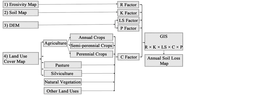 where A is the annual average soil loss per unit of area (t∙ha−1∙yr−1), R is the rainfall-runoff erosivity factor (MJ∙mm∙ha−1∙h−1∙yr−1), K is the soil erodibility factor (t∙h∙MJ−1∙mm−1), LS is the slope length and slope steepness factor (dimensionless), C is the crop management factor (dimensionless), and P is the erosion control practice factor (dimensionless). Integrated into a GIS, soil erosion loss was calculated on a cell-by-cell basis in order to recognize the spatial patterns of soil loss. Thus, each factor was calculated taking grid cells of 2822 m × 2822 m as reference and an uniform spatial analysis environment for GIS modeling was established [22] . In general, grid cells should be as small as possible to allow erosion to be characterized with a better resolution [22] . However, in this study, we had to use a 2822 m spatial resolution for all factors considered because no references about R-factor was found with better resolution than 2822 m for the study area. Spatial distribution of soil erosion loss was produced multiplying all factor layers to produce a final map. The methodological approach followed in RUSLE has been detailed in the simplified flowchart depicted in Figure 2.