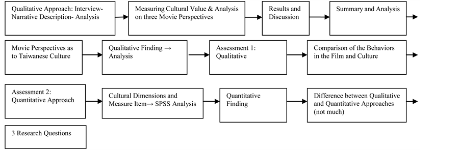 On literature, Ideology is a key term in literary, cultural, and film studies; in 2007 Geertz [15] proposed Ideology as a Cultural System; Definition of ideology from the Merriam-Webster [16] Online Dictionary with audio is: (a) A systematic body of concepts especially about human life or culture. (b) A manner or the content of thinking characteristic of an individual, group, or culture (Merriam-Webster). Movies are part of popular culture, and culture existence could be recognized through measuring culture elements/value from movie perspectives. As mentioned above, culture is so close related with Ideology, according to Dunning, if Ideological Changes (Reconfiguration belief systems or else), which represents one of key features of globalization, then, everybody knows that globalization would be popular. Consequently, this study was designed to explore the problem of globalization by basically examining, measuring and analyzing the perspectives on the film from randomly selected respondents and a questionnaire to assess its effectiveness in Taiwan. Refer to the Figure 1, structure flowchart.