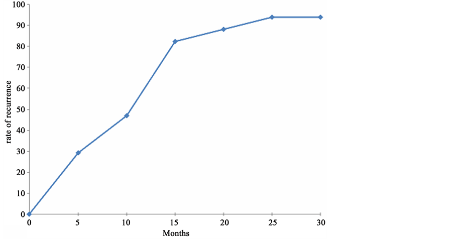 Among the 37 patients included in this study, 17 patients (46% of the cases) developed a bladder tumor recurrence within an average period of 12 months (range 3 - 31 months) after the NUT and 94% of them had a bladder recurrence within the two following years (Figure 1). The average age of the patients diagnosed with UUT-UC was 72 years (range 48 to 83 years), with a sex ratio of 2:1 (25 men and 12 women). The average age of the population with a bladder recurrence was 68.76 years (standard deviation 9.98). In our series, UUT-UC lesion was in the supra iliac ureter for 21 patients (52.5%) in the subiliac ureter for 19 patients (47.5%). When there was a bladder tumor recurrence, the histological distribution was: 13 patients pTa tumors (76%), 2 pT1 tumors (11.7%), 11 patients had a high stage lesion (64%) whereas 4 patients a low stage lesion (23.5%) (Table 1). We also assessed UUT-UC primitive lesion characteristics for the 17 patients with bladder tumor recurrence: in 82% of the cases, the tumor was low stage (14 patients) and in 3 cases the lesion was high stage (17.65%). Only one case of bladder recurrence had an in situ carcinoma. Moreover, 2 patients who were highly suspected to develop tumor recurrence died before the final histological diagnosis, they were not included in the 17 patients with bladder tumor recurrence. The UUT-UC localized in the supra iliac ureter had a higher risk of bladder recurrence (p = 0.04). We observed that 64% of the bladder tumors were at the same time high stage and mutlifocal tumors (Table 2). As regards bladder recurrence topography, we noted that 47% of the lesions were found on the NUT homolateral bladder lateral side, whereas in 3 cases the bladder recurrence was situated near the area of