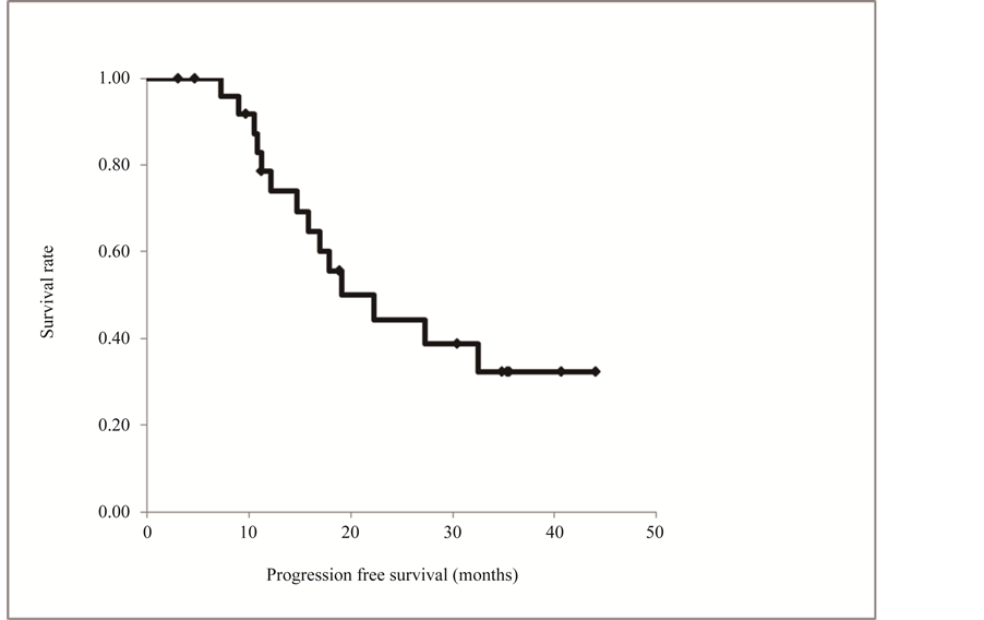 The progression-free and overall survival curves are shown in Figure 1, although these survival data are incomplete. Nine patients died during the follow-up period, and 12 of the 19 survivors had no tumor recurrence. The median progression-free time was 19.1 months (range 3.0+ to 44.1+ months). The overall survival curve did not reach 50% and the median survival time was not determined (median 36.9+ months). Among the 21 patients who were followed up for more than 2 years, 14 survived for this period (Figure 2).