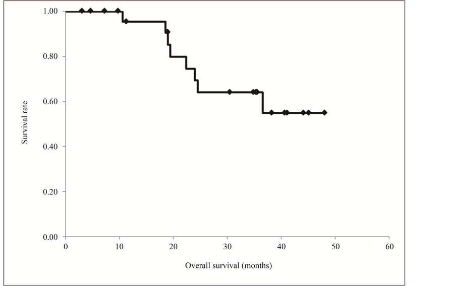 Figure 2. Overall survival curve constructed by the Kaplan-Meier method. The overall survival curve did not reach 50% and the median survival time was not determined (median 36.9+ months). Among the 21 patients who were followed up for more than 2 years, 14 survived for this period.