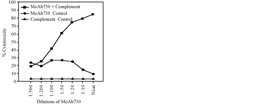 The cytotoxic action of MoAb 730 plateaued at killing only 70% - 80% of DU-145 cells, pointing to the existence of heterogeneity of cell types in cancers, thereby demanding the requirement of additional antibodies targeting alternate epitopes. Three more monoclonal antibodies were developed [4] . Employing a combination of these enabled the killing of nearly 98% of DU 145 cells (Figure 5).