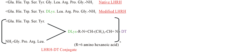 We made a synthetic vaccine against LHRH, replacing glycine at position 6 by lysine, to which via a linker, a carrier tetanus toxoid (TT) or diphtheria toxoid (DT) was conjugated [1] (Figure 1).