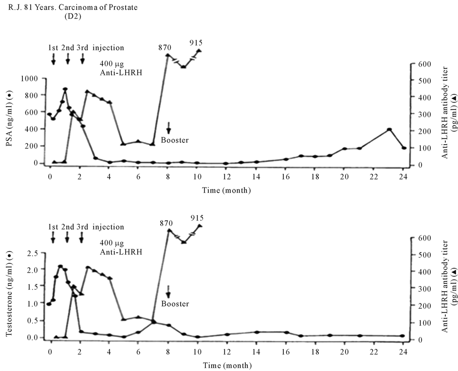 This vaccine generated bioeffective antibodies against LHRH, causing a virtual orchiectomy with testosterone declining to near zero levels [2] . After toxicology and safety studies and permission of Ethical and Drugs Regulatory Authorities, it was employed in 28 patients of Carcinoma of Prostate in 2 Centers of India, the All India Institute of Medical Sciences (AIIMS), New Delhi and Post Graduate Institute of Medical Education and Research (PGIMER), Chandigarh, and one in Austria, the Urologische Zentrum Salzburg. Figure 2 shows its action in a patient in Austria. After 3 primary immunization of the vaccine given at monthly interval, anti-LHRH antibodies were generated, which brought down the testosterone of the patient, as also PSA (Prostate Specific Antigen). On decline of antibodies, these increased again, but were again brought down by a booster injection of the vaccine.
