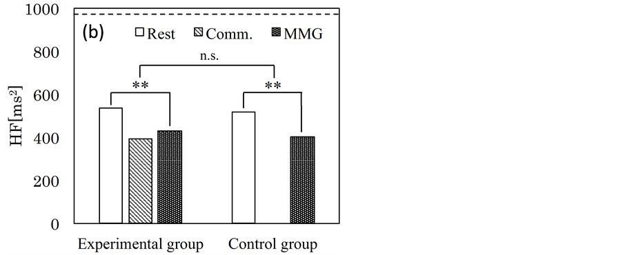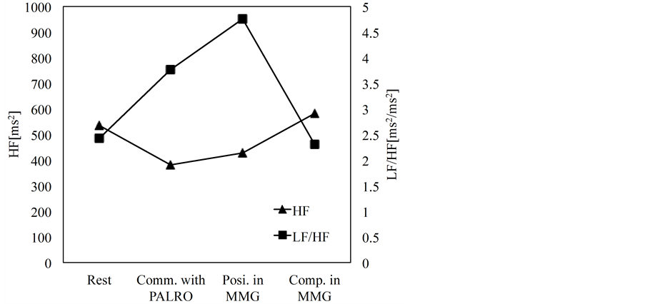 Figure 7 indicates mean HF and mean LF/HF of the experimental group. In