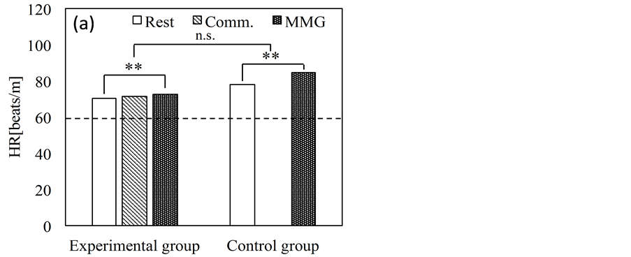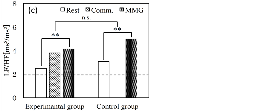 Figure 6. Average values of autonomic nervous indices in each phase. (a) HR, (b) HF, (c) LF/HF. **: p < 0.01. The dotted lines indicate normal values of standard measures of HRV (HR: 60 beats/m, HF: 975 ± 203 ms2, LF/HF: 1.5 - 2.0). If the obtained HR is larger than the normal value, the subject may not be at a relaxed state at least. If the obtained HF is larger than the normal value, parasympathetic nerve may be active. If the obtained LF/HF is larger than the normal value, sympathetic nerve may be active.