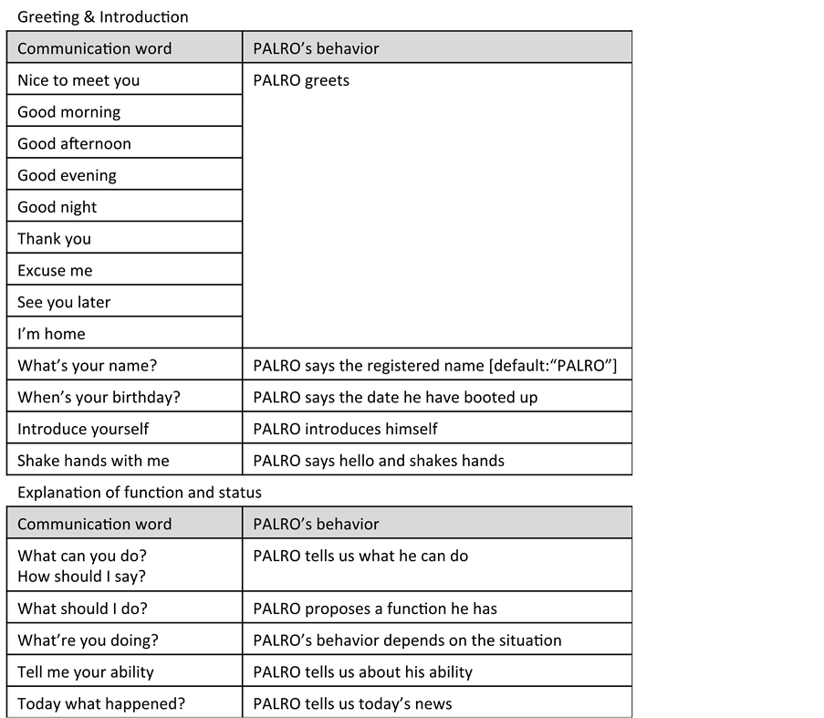 Figure 3. Examples of communication words for PALRO (actually Japanese only) [PALRO user manual: http://www.palrogarden.net/palro/main/_userdata/PALRO_usermanual_ALL.pdf].