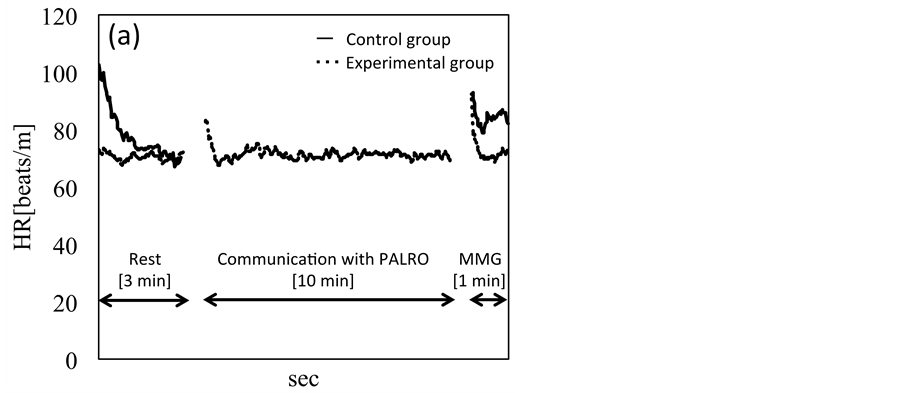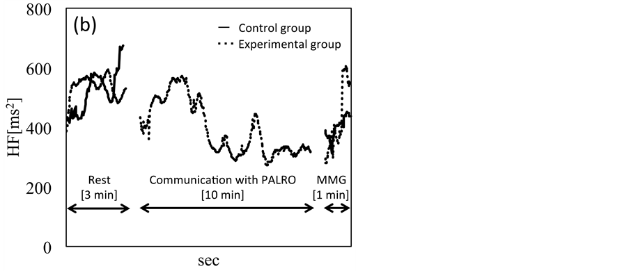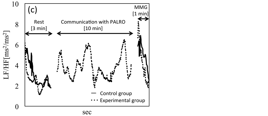 Figure 5 illustrates three time-series graphs of mean HR, mean HF and mean LF/HF of the experimental and the control groups. In the experimental group, HR hardly fluctuated during communication with PALRO [Figure 5(a)]. On the other hand, HF decreased gently and LF/HF fluctuated widely during communication with PALRO [Figure 5(b) and Figure 5(c)].