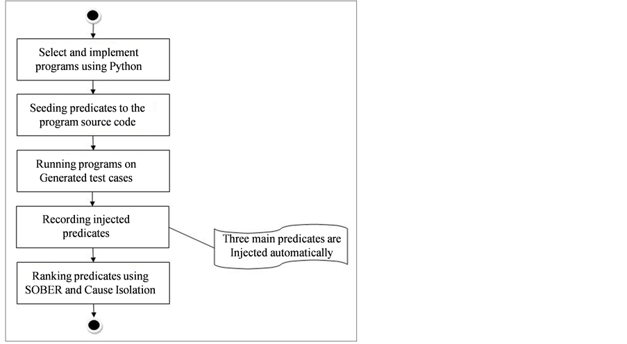 All the experiment steps were performed on a 2.20 GHz Intel core i7 MQ CPU with 8 GB physical memory running Microsoft windows 7 professional service pack 1. We implemented SOBER and Cause Isolation algorithms using Matlab R2009a. Python version that was used in writing tested programs was 2.7.10. We recorded only two types of predicates in order to monitor the programs behavior, branches and returns which were described in the previous section. Scalar pairs predicates were dropped, this dropping reduced the overhead by half without affect the localization effectiveness significantly [8] .