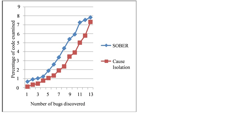 code required to discover all bug related predicate was less than 8%.The result of the comparison between SOBER and Cause Isolation algorithms is shown in Figure 2. As shown in the figure, SOBER algorithm required more code examination than Cause Isolation when applied on a set of Python programs. For example, to discover 9 bugs using Cause Isolation algorithm, we need to examine about 3.4% of the code, while we need to examine 5.3% of the code when using SOBER algorithm.