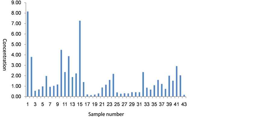 Figure 4. Concentrations of antinomy (Ce) detected in the 43 water samples analyzed in this study by ICP-MS.