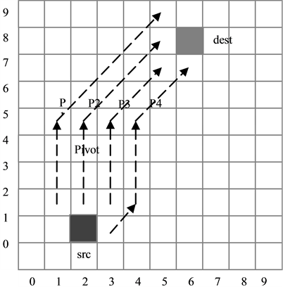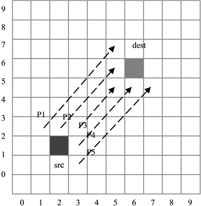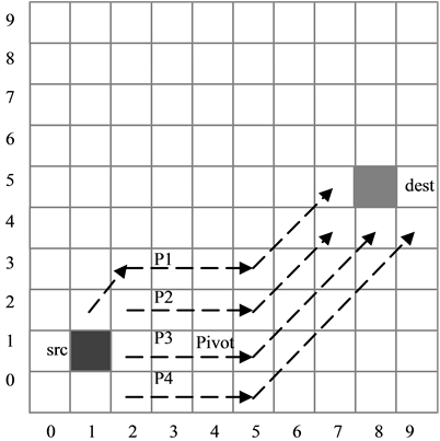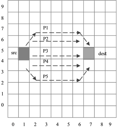 Under this condition, if the source x-coordinates is at xs = 0, or destination y-coordinates at yd = yT, then the set of disjoint paths would be adjusted accordingly. The same approach applies for determining the disjoint routing paths for the other directions. The lengths of the disjoint paths, lp, are in the range