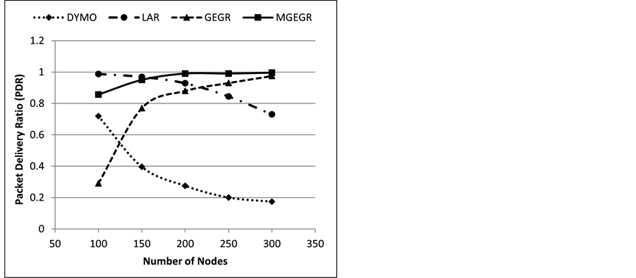 In this work, we have focused on three performance metrics for comparisons among MGEGR, GEGR DYMO and LAR protocols. These are the packet delivery ratio (PDR), the end-to-end delay (sec.), and the average energy consumption (mJoule). The PDR is defined as the ratio of the total number of packets received by the destination (i.e. sink) to the total number of packets transmitted by all nodes. The end-to-end delay is the average duration taken by a packet starting from the time it is transmitted by the source to the time it is being received by the sink. The end-to-end delay includes the waiting times in interface queues, processing times, retransmission delays by the MAC protocol, and propagation time. The average energy consumption refers to the total energy consumed in the network during transmission and reception. The energy consumed during idle time is not counted. In this work, we will use the average energy consumption level of the network as an indicator of the cost of the routing protocol. We have counted the number of discovered holes as an indication to network partitions. In this work, the lifetime of the network is defined as the first time at which a source or intermediate gateway discovers that it does not have a path to the destination. In case of the GEGR scheme, a network partition is recorded when the first time a neighbouring grid hole or dead gateway is discovered by a source or intermediate gateway. In the case of MGEGR, a network partition is recorded when a source gateway loses all defined paths to the sink by the protocol.