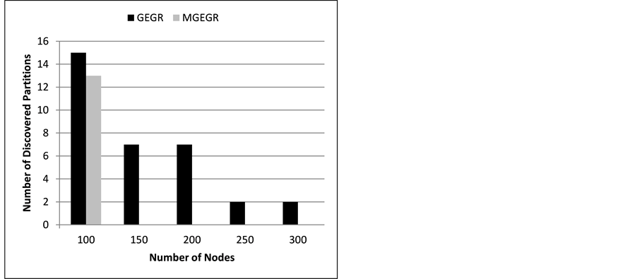 In this work, we have tested the PDR of GEGR and MGEGR schemes under varying failing ratios for number of nodes equal to 100, 200, and 300. We have applied uniform failing ratios of {0.0, 0.1, 0.15, 0.2, 0.25, and 0.3} at each originated packet transmission from each gateway. The first time a hole is discovered by the GEGR protocol is at 10 seconds of the simulation time, for all failing ratios and at all number of nodes considered. This situation indicates that the network is partitioned in the case of the GEGR protocol from the starting time of data forwarding. On the other hand, the first time a hole is discovered by the MGEGR protocol is at 15 seconds of the simulation time for all failing ratios at 100 nodes only. However, we can draw comparisons between the two schemes based on their PDRs vs. the failing ratios, as shown in Figure 9 and Figure 10. Obviously, MGEGR protocol shows better PDR performance than GEGR for number of nodes equal to 100 and 200, where the nodes density is relatively low, due to its ability to avoid paths with existing holes or dead gateways. In general, both schemes can have dead gateways replaced by newly elected ones, when there is more than one gateway in the same cell. Therefore, the PDR performance of GEGR becomes close or the same to MGEGR at number of nodes equal to 300.