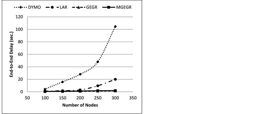 Figure 7 shows the relationship between the average end-to-end delay and the number of nodes for MGEGR, GEGR, LAR, and DYMO protocols. The end-to-end delay for the GEGR and MGEGR protocols are minimal compared to the other two protocols, due to the optimal or near-optimal grid-based routing. For the LAR protocol, the end-to-end delay is slightly higher than GEGR and MGEGR, and it shows adequate performance. However, the DYMO routing cannot function adequately in a dense wireless network with periodic transmission from nodes to the sink, since it is not able to maintain sustainable routes to the sink.
