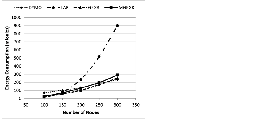 Figure 8 shows the relationship between the network energy consumption and the number of nodes in for MGEGR, GEGR, LAR, and DYMO protocols. The GEGR protocol consumes less energy than MGEGR and the other two protocols, mainly due to its optimal routing paths. Although the LAR protocol energy consumption is close to GEGR and MGEGR at number of nodes of 100 and 150, its energy consumption starts to increase at 200 nodes rapidly with the increase in the number of nodes. Definitely, LAR protocol cannot achieve the required scalability in the number of nodes for WSN, due to the increase of the number of control packets and the increase of packet retransmission, as supported by the continuous decline in its PDR values, and gradual increase of the end-to-end delay with the increase in the number of nodes. The performance of the DYMO protocol energy consumption is misleading, because it shows proper level of energy consumption, but that due to the small number of packets being transmitted and delivered to the sink.