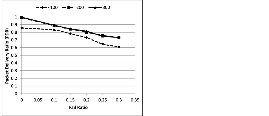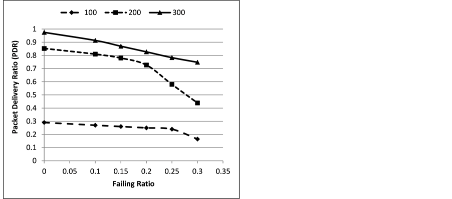 Figure 10. MGEGR Packet delivery ratio vs. failing ratio for random deployment.