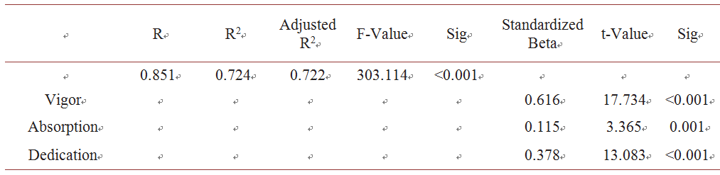 The correlation coefficient R = 0.851 which indicates that the relationship between employee engagement and organizational performance is positive and that both variables change in the same direction. The coefficient of variation R2 shows that 72.4% of the variation in the dependent variable (organizational performance) is explained by the independent variable (employee engagement). The adjusted R2 indicates the generalizability of the model. It allows generalizing the results taken from the respondents to the whole population. It is noticed that the value of the adjusted R2 = 0.722is close to the value of R2 = 0.724. If the adjusted R2 is excluded from R2 the value will be (0.724 − 0.722 = 0.002). This amount of reduction means that if the whole population participates in the study and the model has been fitted then, there will be 0.2% less variance in the outcome. The analysis of variance (ANOVA) allows us to statistically test the main null hypothesis. The above table 4 shows the results of the ANOVA test, where the F-ratio = 303.114 and the p-value = 0.000, this result indicates that there is less than 5% chance that an F-ratio of this value would occur solely by chance. Since the p-value (<0.001) is smaller than the significance level (0.05), the null hypothesis is rejected and the alternative hypothesis is accepted indicating that there is a relationship between employee engagement and organizational performance.