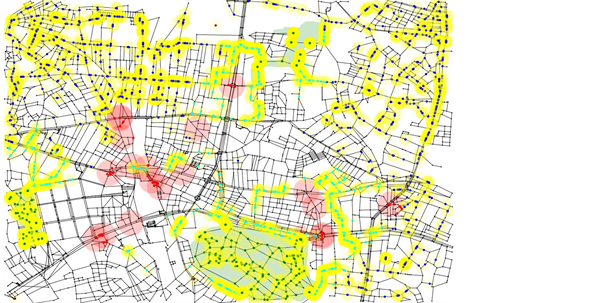 To evaluate the benefits of using MANETs, we simulated evacuees’ movements and communication. Figure 2 shows our map-based simulation.