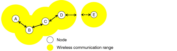 The following is a typical explanation of MANET. Nodes require no central server or infrastructure to communicate with each other. From the viewpoint of the network, each node is both a host and a router. Nodes communicate with each other using a wireless communication method such as Wi-Fi. Multihop communication is provided by nodes working as routers, but we must consider that nodes can move when they want to. When a router node moves out of another router’s communication range, a multihop communication using the router is broken. Figure 1 shows an example of a multihop communication. Node D can communicate with A via B and C, but E cannot communicate with other nodes because there is no other node on the communication range of E. In a disaster situation, a node is a wireless communication device such as a smartphone owned by an evacuee. Therefore, to maintain multihop communication is difficult, because nodes move frequently for evacuation.