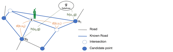 Calculating of the evaluation value of a candidate point is based on the A* algorithm. An evacuee is at point s. A candidate destination point is u. The point of a known intersection included in a safe area and the closest to u is g. The agent can calculate d(s, u) the shortest known route path length from s to u, from knowledge of the length of roads. h(u,g) is the estimation of the shortest route path length from u to g. We implemented this as the Euclidean distance from u to g.