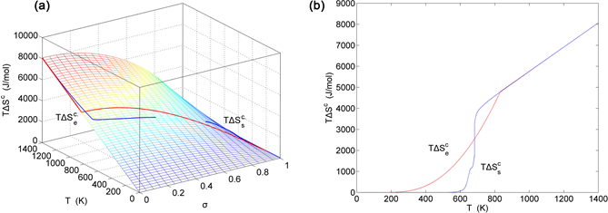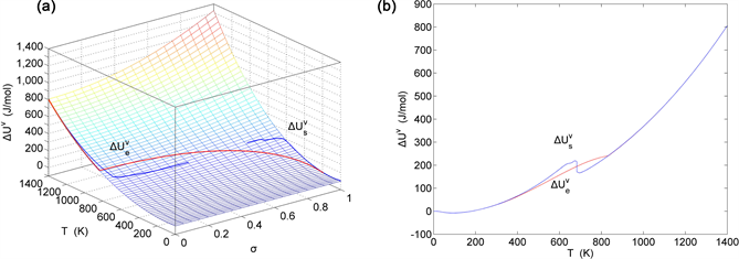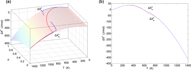 Figure 2. Path charts on disordering AuCu alloy. (a) Three dimension mixed Gibbs energy chart with equilibrium path and subequilibrium path; (b) Two dimension equilibrium path and subequilibrium path.