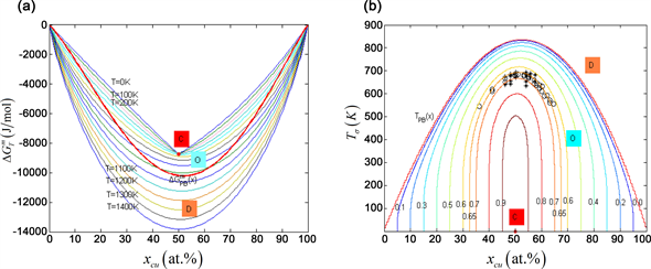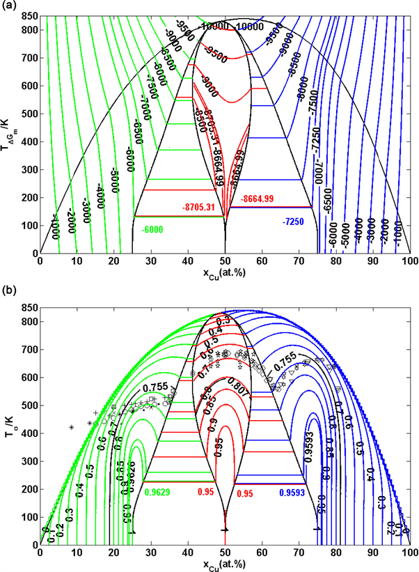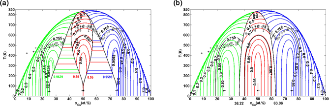 Figure 4. Phase diagrams of Au-Cu system. (a) Equilibrium order degree EAHNP phase diagram with iso-order degree curves and experimental jumping -temperatures [15] ; (b) Subequilibrium order degree SAHNP phase diagram with iso-order degree curves and experimental jumping -temperatures [46] .