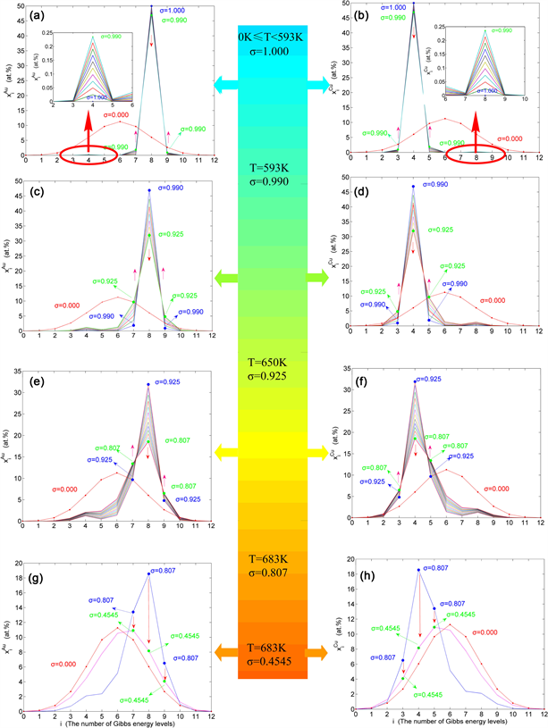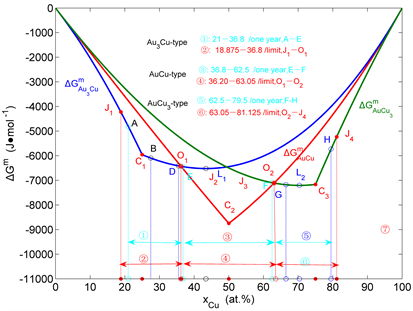 The essential definition of equilibrium evolution described by AG-minimal Gibbs energy path (MGEP) equilibrium transmissive mode is that “the AG-GE ( , ) levels and AG-probabilities ( , ) occupied at the lattice points/AG-GE levels can respond immediately and change synchronously with each small variation in temperature, and proceed along the minimal Gibbs energy path, supposing to have no obstacle to atom movement”. The , , equilibrium path charts may be calculated by iso-order degree or isothermal path methods (Figure 2, Supplementary Information (1) 2.1). The MGEP mode leads to equilibrium EAP theory, which includes EAP thermodynamics [45] [46] [47] [48] , EAP valence bond theory [41] [42] [43] [44] and EAHNP phase diagrams of alloy phases (Figure 3). Then, the equilibrium EAS theory and EAHNP phase diagrams of Au-Cu system (Figure 4) have been established by Equilibrium Lever numerical NLN method of isothermal Gibbs energy curves.