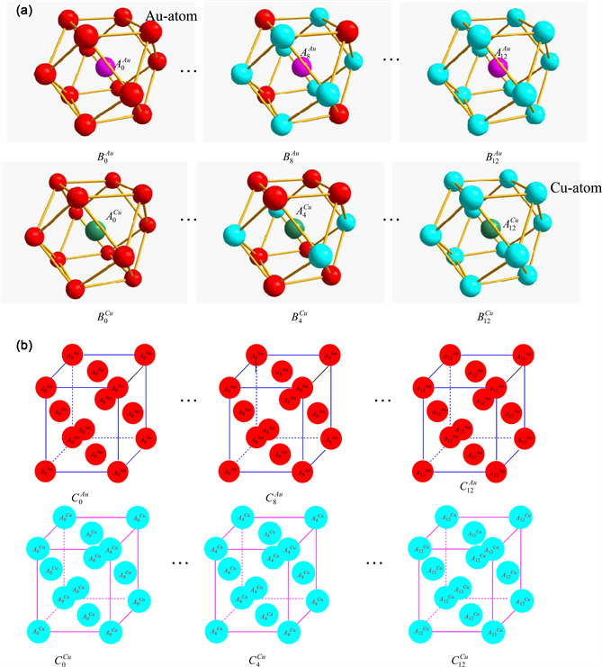 Figure 5. Three structural unit sequences. (a) Basic coordination cluster B-sequences and alloy gene A-sequences in fcc-based lattice Au-Cu system: , and , ; (b) AG-characteristic crystal C-sequences: , .