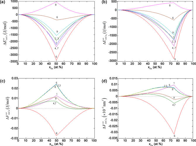 Figure 7. Choice among E- and V-functions. (a) (b) Excess potential energy differences and relative to disordered Au(1−x)Cux alloys; (c) (d) Excess volume differences and relative to disordered Au(1−x)Cux alloys.