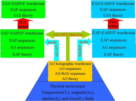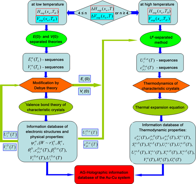 The establishment of AG-holographic warehouse is the first stage for establishing EAHNP bank of alloy systems. It can be explained by taking the fcc-based lattice Au-Cu system, which has been considered to be classical paragon studied nearly by almost conventional and modern measurement methods for one century [51] - [77] . The AG-WOP methods include the separated and chosen methods of AG potential energies and volumes sequences, and the calculated methods of AG valence electron structures, physical and thermodynamic properties [78] - [86] (Figure 6).