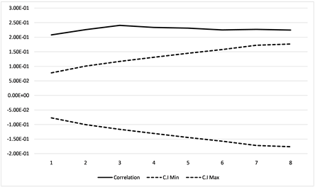 To test the hypothesis-H1 stated in Section 2.3, we undertake t-tests, with the size of the test being α = 5%. For the sub-sample#1 (Table 1) and sub-sample#2 (Table 2), correlation remain significantly different from 0 as k-week goes from 1 to 8. It is evident from Figure 1 that beyond k-week = 3, correlation appears more or less flat. It undergoes a slight decrease in case of sub-sample #2. Based on the t-tests, we reject the null hypothesis H1 at 95% confidence level for sub-sample#1 and sub-sample#2. Further, it can be observed that the level of correlation has increased for each k-week, subsequent to the global financial crisis (i.e. during sub-sample#2) (Figure 2).