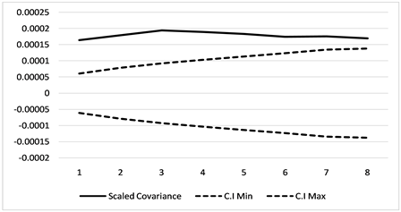 Table 9 and Table 10 show information pertaining to scaled cov-diff. Figure 9 and Figure 10 represents the information summarized in Table 9 & Table 10. Scaled cov-diff captures the difference between k-week covariance and 1-week covariance. If the value of scaled cov-diff is not statistically different from 0, it suggests that there is no lag in information transmission between the markets. In this case, US is the bigger market and Indian stock market is more like a satellite to it. Failing to reject the null-H4 (Section 3.2) indicate that the transmission of information from the US market to the Indian market happens within the same week.