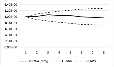 Table 5 and Table 6 summarize information about k-week V-ratio of Nifty index during sub-sample#1 and sub-sample#2 respectively. During sub-sample#1 the deviation of V-ratio remain significant till k-week = 4 and becomes insignificant