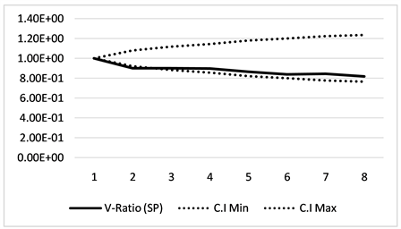 If the V-Ratio is not significantly different from 1, then the weekly stock prices follow a standard normal distribution asymptotically. That is to say, the stock prices tend to follow a random walk. This acts as an indicator of market efficiency.