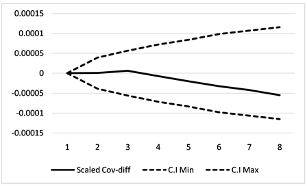 If k-week SCD is significant, it means that scaled k-week covariance is significantly different from scaled 1-week covariance. This suggests that there is a lag in information/shock transmission between the markets under consideration. SCD being insignificant indicates that the k-week covariance is not statistically different from 1-week covariance. This means that there is no lag in information or shock transmission between the markets. Therefore SCD serves as an indicator to test the joint efficiency of markets.