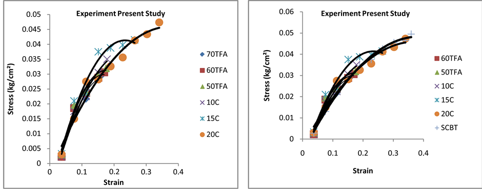 stress-strain curve comparison for six different combination grades of moulds TFASDRT. Data points represent experimental results and solid lines represent corresponding trend lines. A comparison of stress-stain curves generated by the TFASDRT and SCBT obtained in the present experimental study is shown in Figure 10(b), which show a very close match between the TFASDRT and SCBT curves.