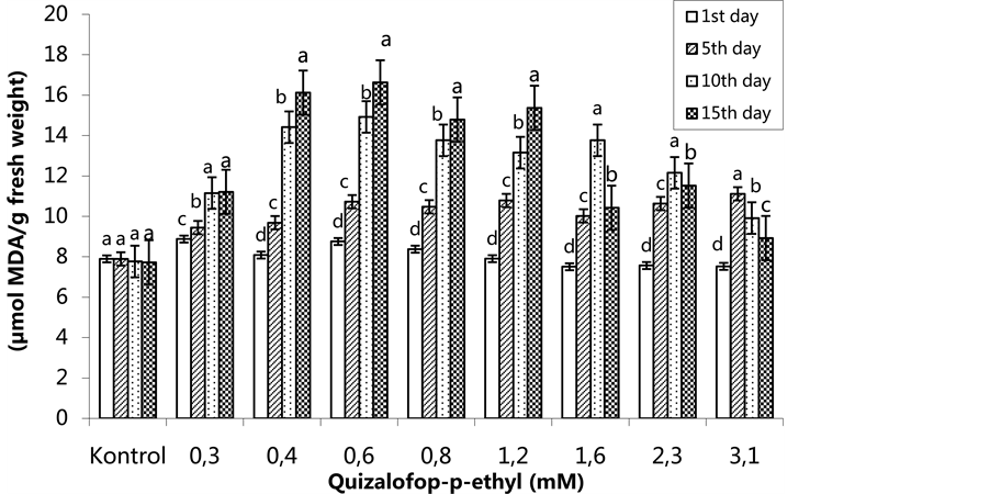 Figure 5. Changes in MDA levels in H. annuus leaves exposed to post-emergence quizalofop-p-ethyl application. Vertical bars represent standard error of average of three replications. Data followed by different letters are significantly different from each other (p < 0.05) according to Duncan’s test.