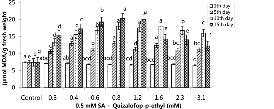 When ROS is generated in excess or when the cellular antioxidant defence is deficient, free radical chain reactions can occur and cause lipid peroxidation. Measuring MDA is a common method of determining lipid oxidation [65] . Li et al. (2012) reported that the MDA content in maize roots was significantly increased only when the atrazine (ATR) concentration was 10 mg/L, whereas there was no significant difference between the ATR treatment and control for the MDA levels in the maize shoots [66] . In the present study, the malondialdehyde (MDA) content was increased on 5th and 10th days, except in the 1.6 - 3.1 mM quizalofop-p-ethyl and quizalofop-p-ethyl + SA-treated groups (Figure 5, Figure 6).