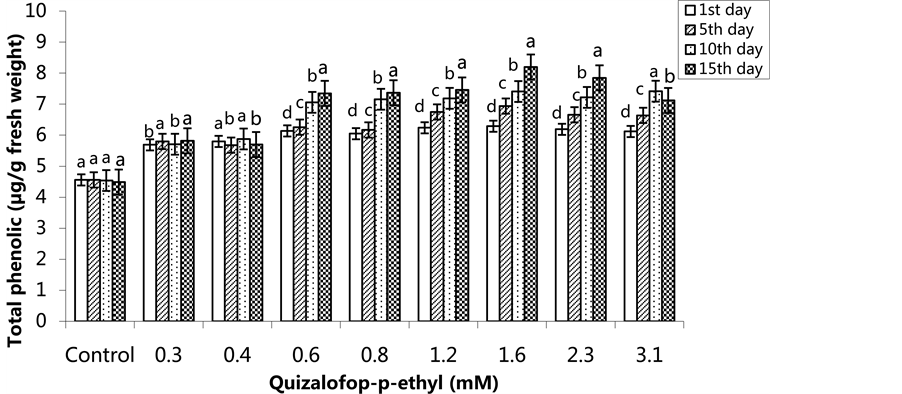 Figure 7. Changes in total phenolic content in H. annuus leaves exposed to post-emergence quizalofop-p-ethyl application. Vertical bars represent standard error of average of three replications. Data followed by different letters are significantly different from each other (p < 0.05) according to Duncan’s test.
