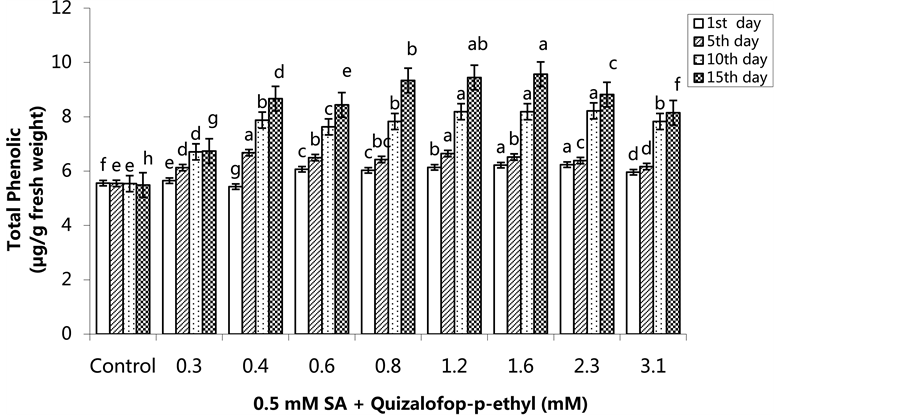 Figure 8. Changes in total phenolic content in H. annuus leaves after pre-emergence 0.5 mM SA and post-emergence quizalofop-p-ethyl application. Vertical bars represent standard error of average of three replications. Data followed by different letters are significantly different from each other (p < 0.05) according to Duncan’s test.
