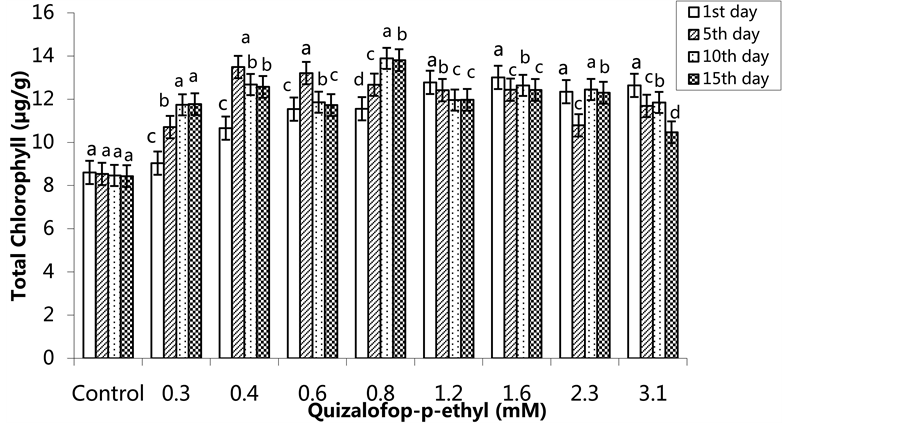Figure 9. Changes in total chlorophyll content in H. annuus leaves exposed to post-emergence quizalofop-p-ethyl application. Vertical bars represent standard error of average of three replications. Data followed by different letters are significantly different from each other (p < 0.05) according to Duncan’s test.