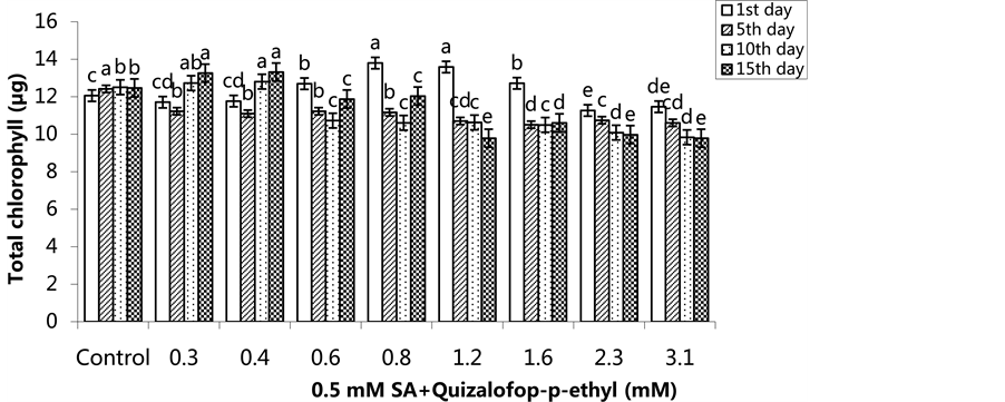 Figure 10. Changes in total chlorophyll content in H. annuus leaves after pre-emergence 0.5 mM SA and post-emergence quizalofop-p-ethyl application. Vertical bars represent standard error of average of three replications. Data followed by dif- ferent letters are significantly different from each other (p < 0.05) according to Duncan’s test.