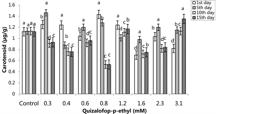 Figure 11. Changes in carotenoid content in H. annuus leaves exposed to post-emergence quizalofop-p-ethyl application. Vertical bars represent standard error of average of three replications. Data followed by different letters are significantly different from each other (p < 0.05) according to Duncan’s test.