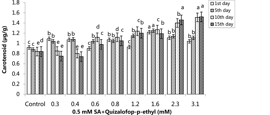 Figure 12. Changes in carotenoid content in H. annuus leaves exposed to pre-emergence 0.5 mM SA and post-emergence quizalofop-p-ethyl application. Vertical bars represent standard error of average of three replications. Data followed by different letters are significantly different from each other (p < 0.05) according to Duncan’s test.