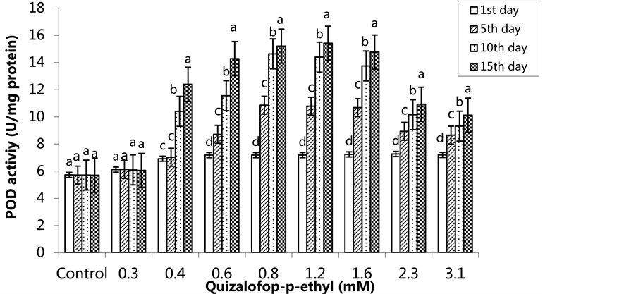 Figure 1. Changes in POD activity in H. annuus leaves exposed to post-emergence quizalofop-p-ethyl application. Vertical bars represent standard error of average of three replications. Data followed by different letters are significantly different from each other (p < 0.05) according to Duncan’s test.