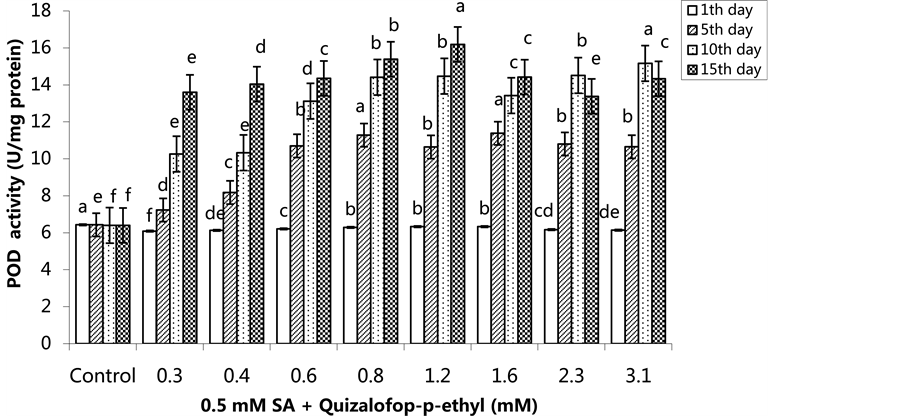 The activity of POD was increased in the treated groups compared to the control group (p < 0.05). We observed the highest POD activity in the 0.8 mM quizalofop p-ethyl treated group on the 5th and 10th days, and in the 1.2 mM treated group on the 15th day (Figure 1) (p < 0.05). In the SA pre-treated plants, the highest POD activity was observed on the 1st day in the control group and the lowest POD activity was in the 0.3 mM-treated group. The POD activity was highest in the group treated with 1.6 mM on the 5th day, the highest POD activity was also observed in the group treated with 3.1 mM on the 10th day. The highest POD activity was 16.19 U/mg protein in the 1.2 mM treated group on the 15th (Figure 2) (p < 0.05).